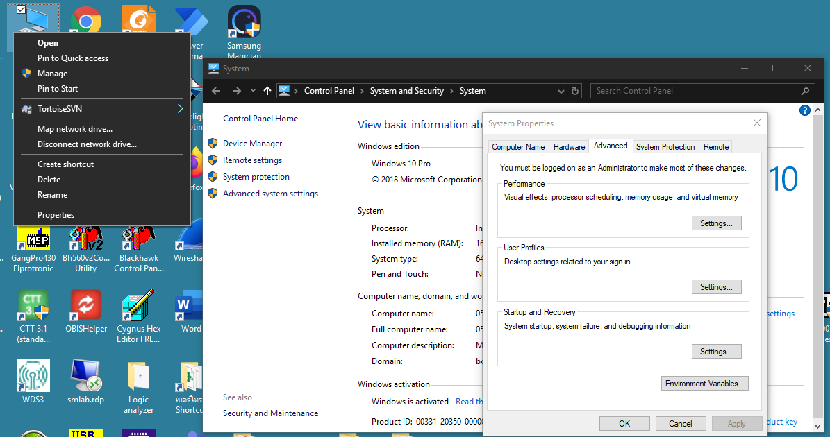 ทำการกำหนด Path ของ compiler โดยไปที่ My com เลือก properties > Advance System settings > แถบ Advanced > เลือก Environment variables