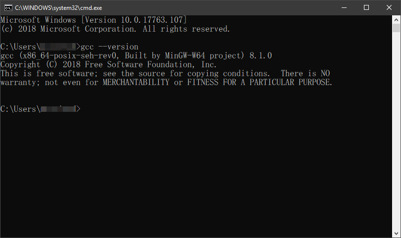 gcc --version gcc (x86_64-posix-seh-rev0, Built by MinGW-W64 project) 8.1.0 Copyright (C) 2018 Free Software Foundation, Inc. This is free software; see the source for copying conditions. There is NO warranty; not even for MERCHANTABILITY or FITNESS FOR A PARTICULAR PURPOSE.